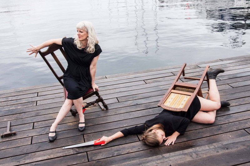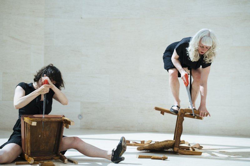 Cinq femmes élégantes, robes noires et talons hauts, vous font face, assises, muettes. Avec des scies en guise d’archets et des chaises comme seuls instruments, ce quintet féminin offre un étrange rituel. Leur objectif est clair : scier les jambes des chaises sur lesquelles elles sont installées, sans quitter leur assise… de plus en plus précaire. Cette drôle de gymnastique donne naissance à une stridente symphonie. Leur lutte pour l’équilibre nous fascine et nous désarçonne. Est-ce que ça va encore tenir longtemps ?