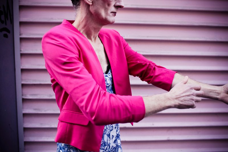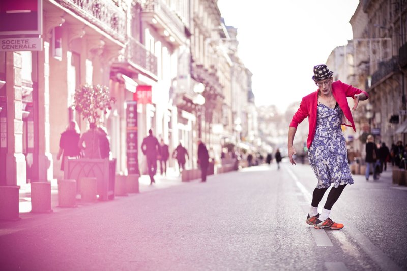 Il y a Pierre Pilatte et cette manière si singulière de jouer avec la rue, avec ses gens qui passent et ses imprévus. Et puis il y a la touchante clownerie de son personnage, Claude. Au rythme d’injonctions sorties d’une boîte parlante, il va peu à peu se métamorphoser. Mi-homme, mi-femme, il s’affuble de symboles féminins : hauts talons, maquillage, robe légère… « Parcours intérieur vécu physiquement, nous entendons sa conscience, sa prise de conscience, la boîte à penser est là, il la porte haut, l’accepte, elle chemine en lui et avec lui. Elle lui donne la force d’affronter le monde, de frotter son corps aux autres, de magnifier la femme qui se cache en lui. » (Zoom à la rue – mai 2013)