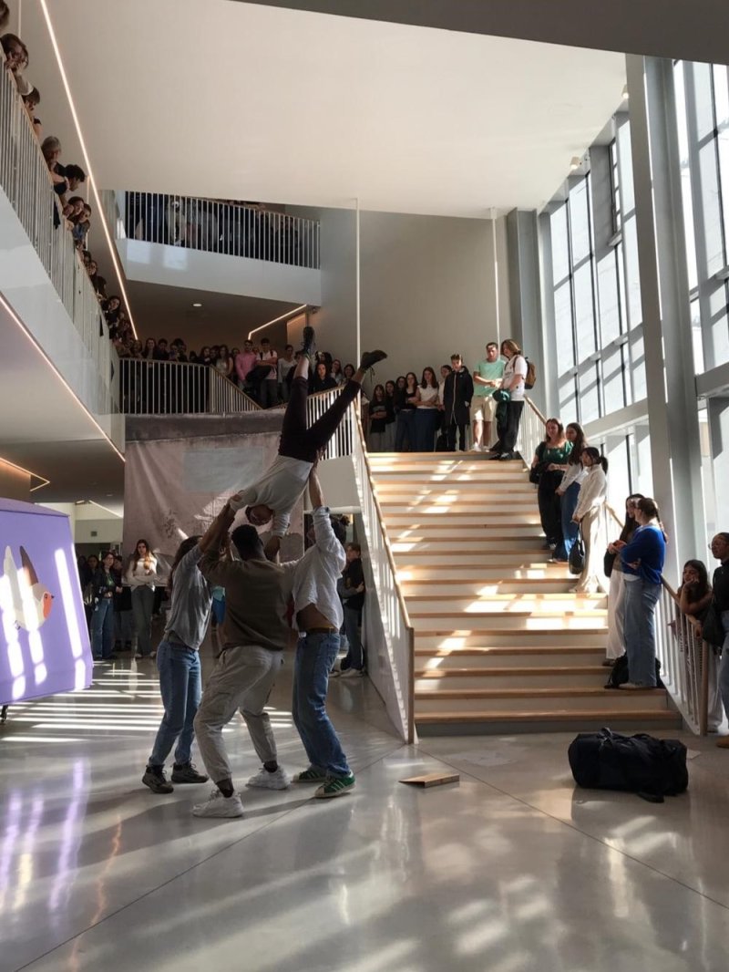 Fin mai 2024, les élèves du lycée ont pu découvrir à trois reprises l’irruption La Lévitation réelle de L’Immédiatau moment d’un intercours, dans le hall et à la cantine. Pour jouer l’effet de surprise au moment d’un intercours, certains membres de la compagnie s’étaient même « infiltrés » en tant qu’agents de service à la cantine.