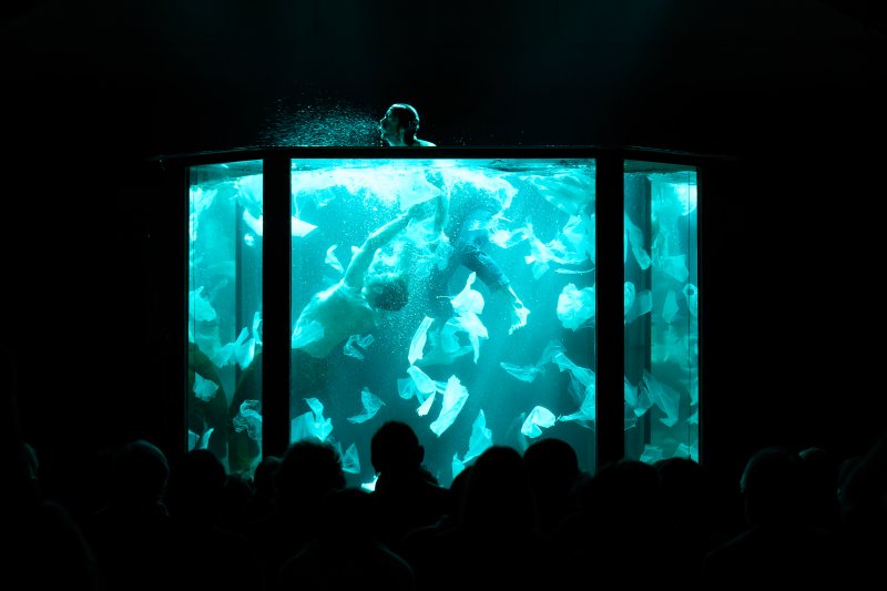 Compagnie née en 2018, Out of the Blue, c’est le rêve de rassembler le cirque et l’apnée autour des corps et des parcours de Sébastien Davis-Vangelder et Frédéri Vernier qui depuis, immergés dans leur (gros !) aquarium, expérimentent l’art de l’apnée comme nouvelle discipline de cirque.