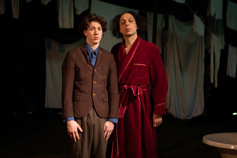 Sous le chapiteau de Sono io ?, un père et un fils (dans la vie comme sur la piste), tous deux clowns, interrogent les difficultés liées à la transmission et à l’héritage, tout en rendant un vibrant hommage au théâtre circassien.