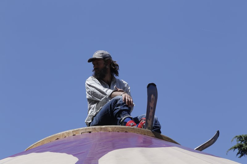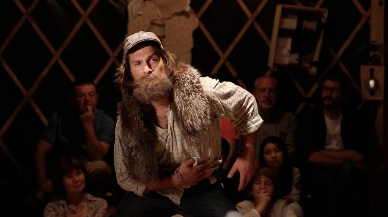 Il est enfermé dans sa vie, sa folie douce et nous sommes enfermés dans sa yourte. Funambule de proximité, son plus grand risque n’est pas la chute, mais celui de cesser d’être un Homme droit. Alors il chante tous ces tubes des années 80 qui squattent nos têtes. Airs de fête et d’amour. L’air de rien…