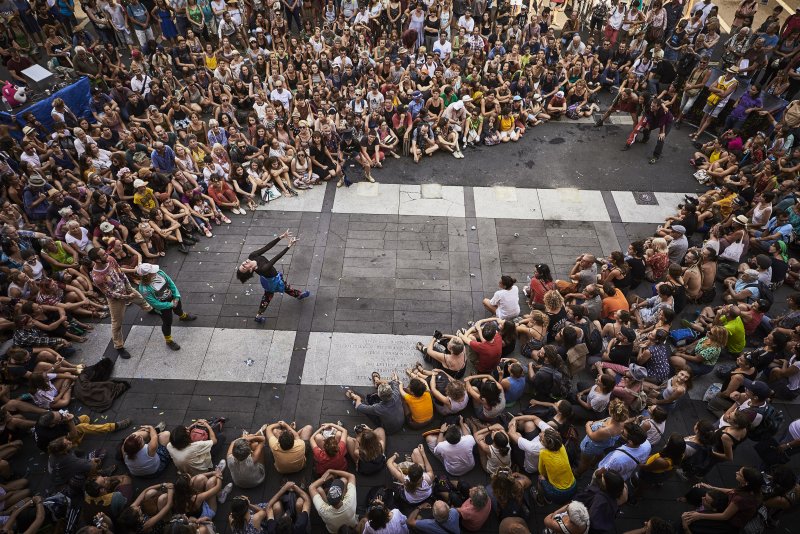Traversant la foule, créant des chorégraphies, les danseurs font surgir des images de bal populaire, de carnaval, de battle, de manifestations aussi. Avec une énergie bouillonnante, leurs mouvements se propagent et se diffusent comme des ondes, alternant entre moments de démonstration et temps de danse collective.