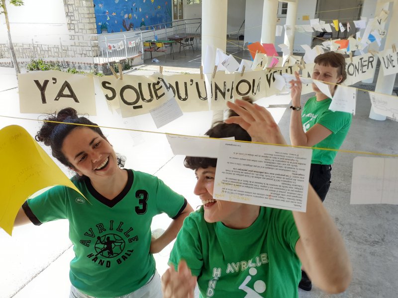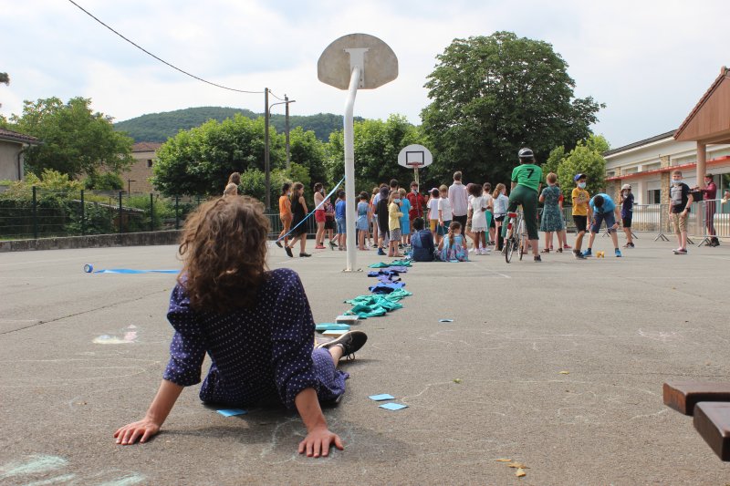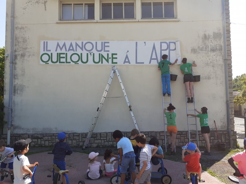 Quelques interpellations collées dans l’espace public, quelques personnages énigmatiques, des saynètes impromptues ici ou là, ont constitué les axes de recherche de ce jeune collectif d’artistes. L’école en a conservé une belle trace sous forme d’une fresque collée dans la cour de récréation, reprenant les questions des artistes et les réponses des enfants qui se sont prêtés au jeu !