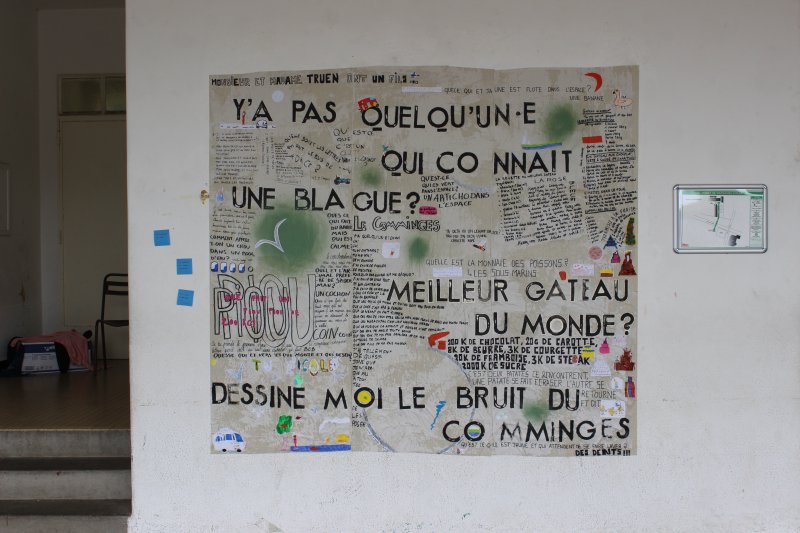Entre le lundi 7 et vendredi 9 juin, à Boussens, Cécile Rutten (apprentie FAI-AR Formation supérieure d’art en espace public à Marseille) et son équipe de « Plateforme bonjour » ont tenté de rentrer en discussion avec des inconnus, à la superette du village, à la gare, dans l’école (sans communication préalable).